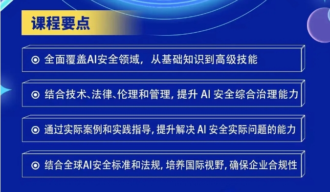 - 合规性保障:员工熟悉国内外AI安全政策和伦理道德,帮助企业建立合规的安全管理体系,避免法律风险,提升企业形象和社会责任感。
